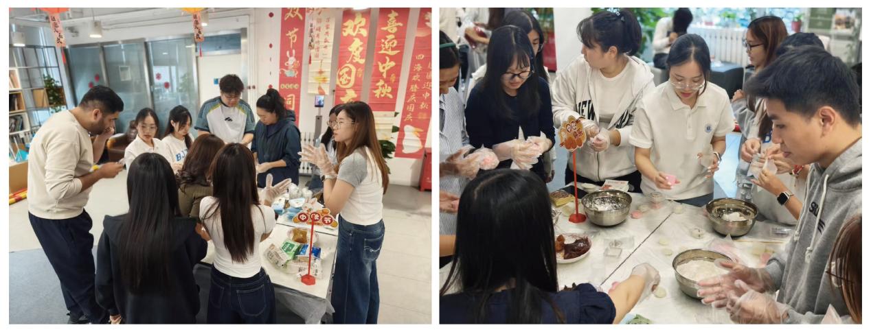 在月饼制作区,留学生们跟着工作人员学习揉制冰皮、包裹馅料、按压模具,一个个造型精致的月饼逐渐成型,无需烘烤即可完成兼具美味与文化意义的中秋美食。