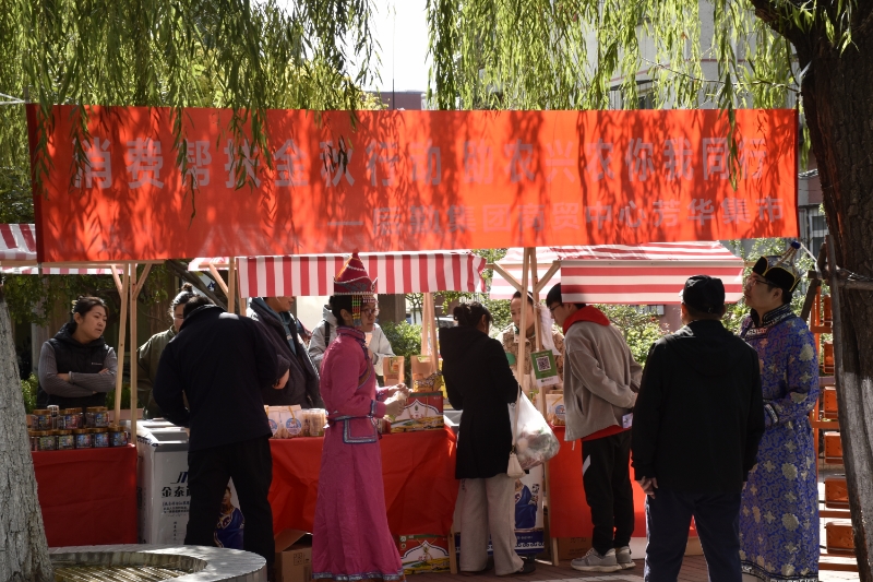 活动当天,家属区集市现场人头攒动、暖意融融。商贸中心提前统筹协调,组织6家信誉良好的超市商户以代销模式入驻,现场陈列的奶制品、牛肉干、有机大米等20余种特色农副产品,均来自科左后旗帮扶一线,以绿色天然的品质与浓郁的乡土特色,吸引了大批师生家属驻足咨询、争相选购,现场购销氛围十分热烈。活动现场,两名身着民族特色服饰的学生志愿者化身“助农推广员”,让消费帮扶理念深入人心,进一步激发了大家的购买热情。