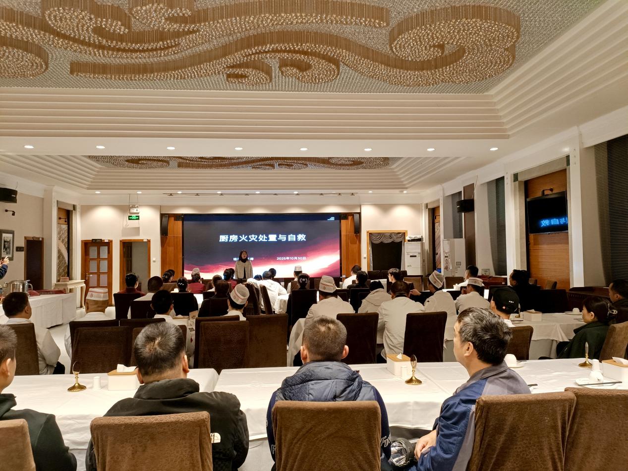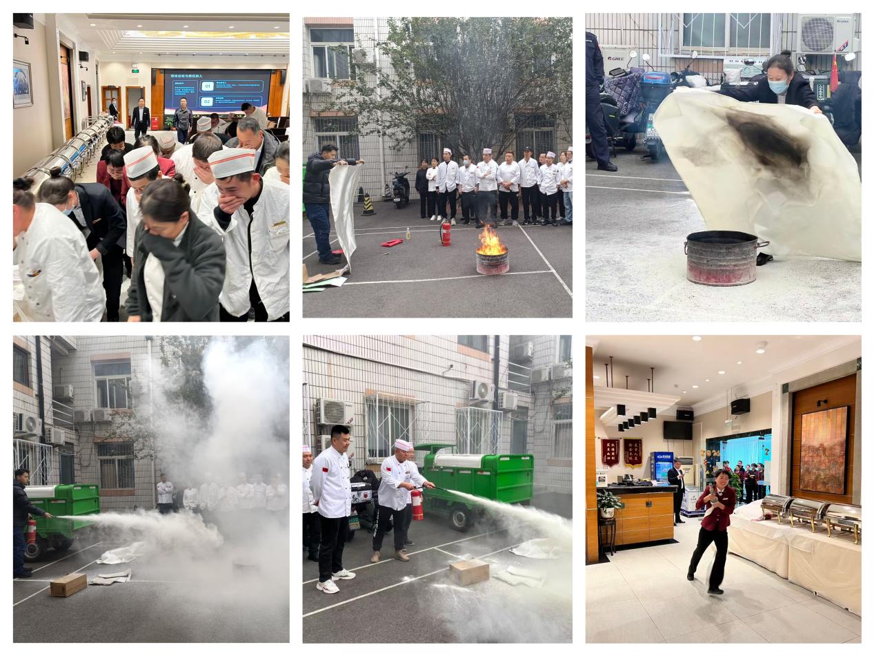 为强化校园餐饮场所消防安全管理,提升职工应急处置能力,2025年10月30日,在学校保卫处的大力支持下,红果园学术交流中心在红果园餐厅组织开展了专项消防演练活动。本次演练以"理论宣讲+实操训练"双轨推进,覆盖厨房火灾预防、应急逃生、初期火情处置三大核心模块,中心领导班子、保障部及餐饮部全体职工参与此次演练。